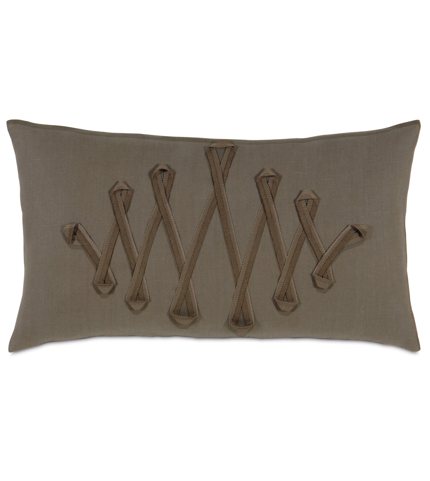 • 100% linen decorative pillow in a solid earth-toned fabric with a twisted ribbon trim applique
