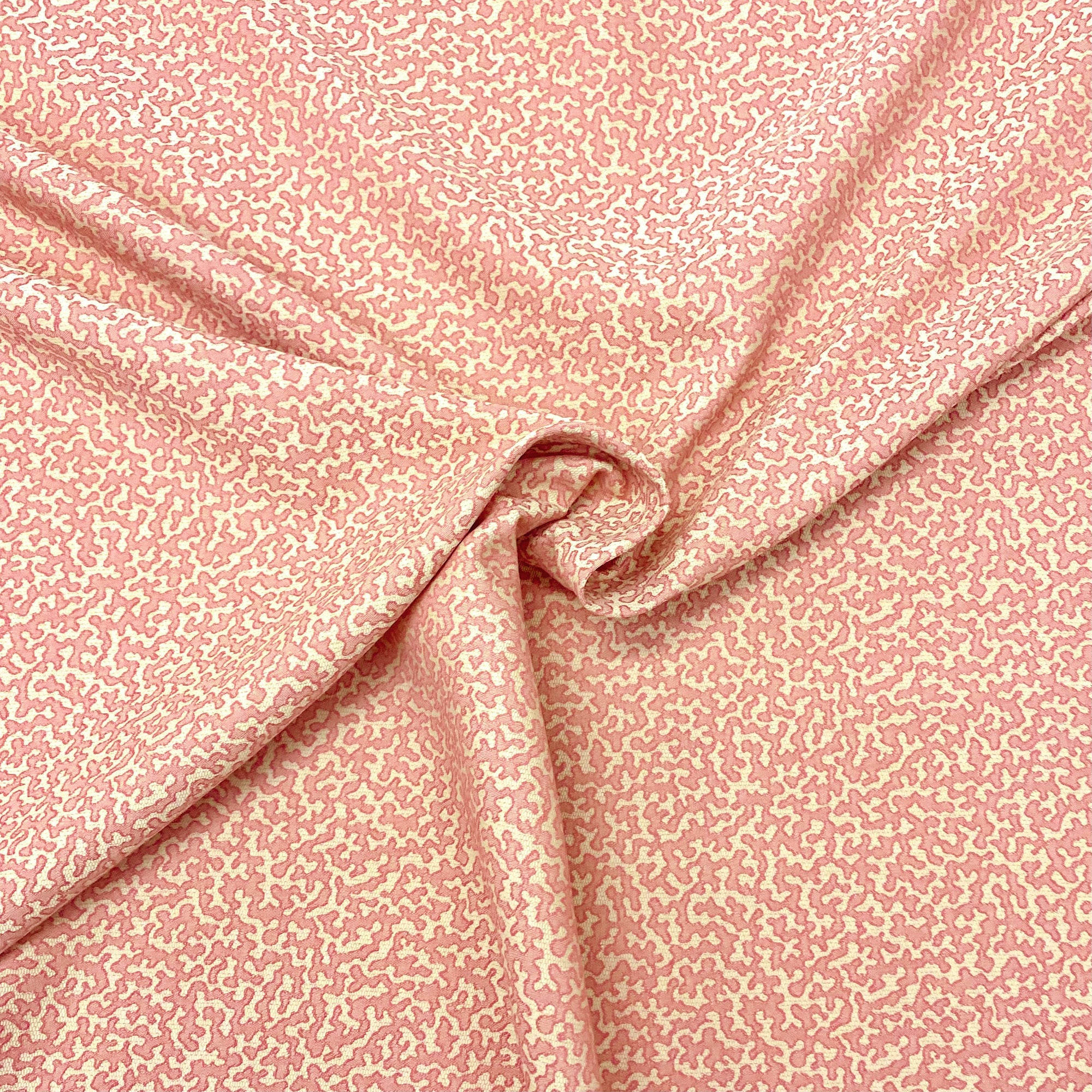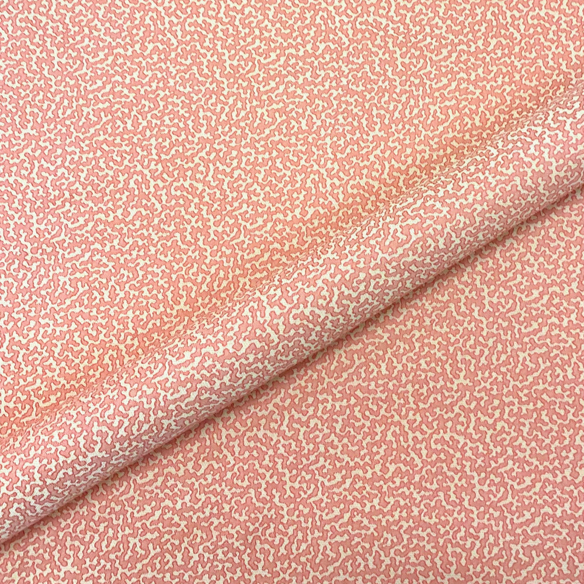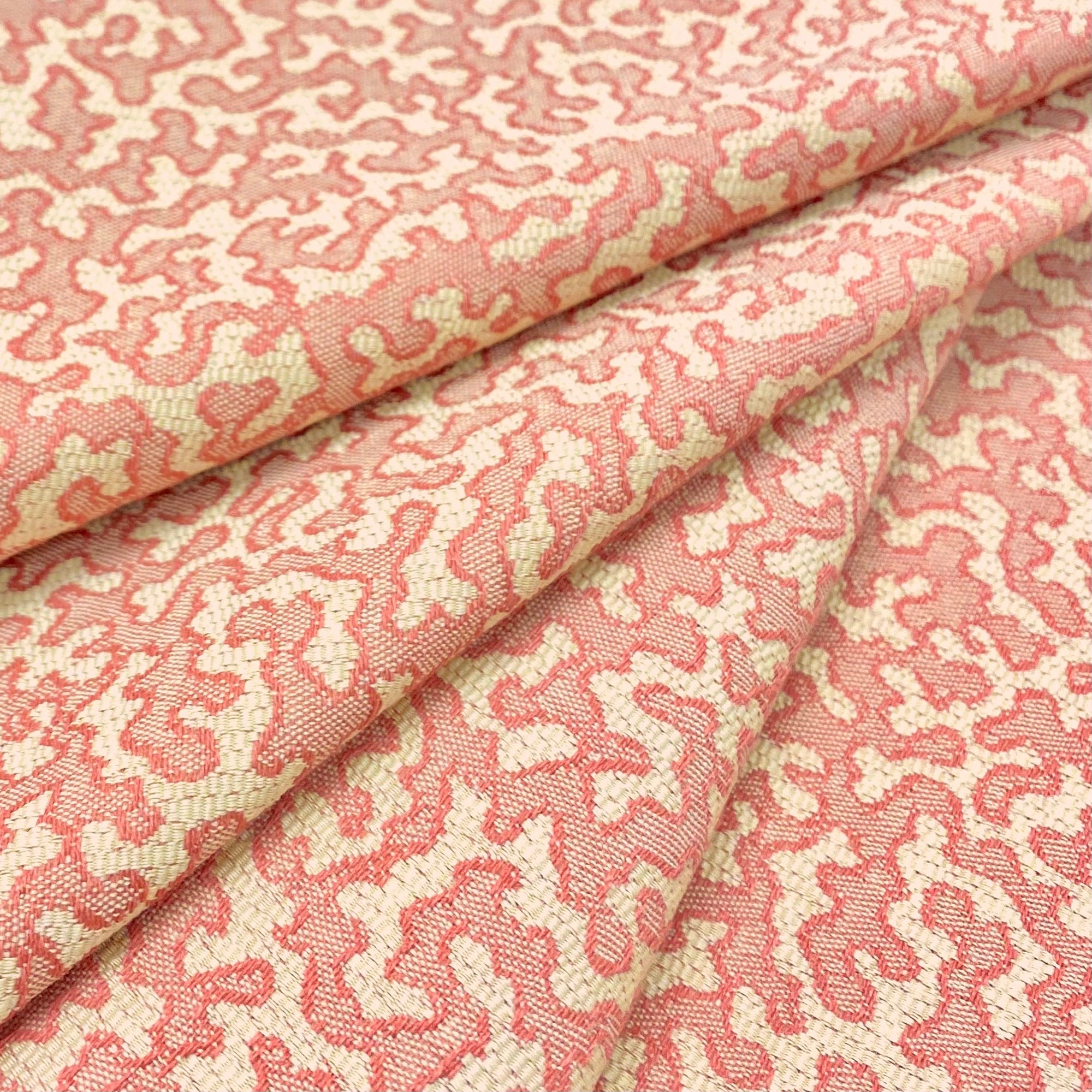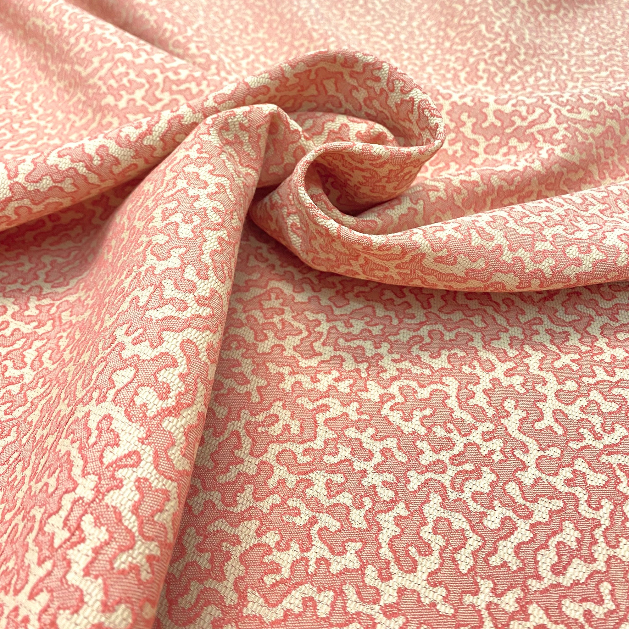 Tropical jacquard upholstery fabric with woven coral pattern in salmon.