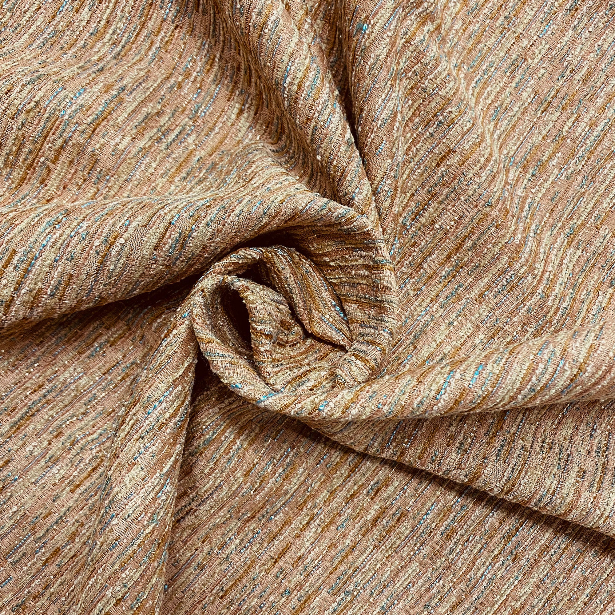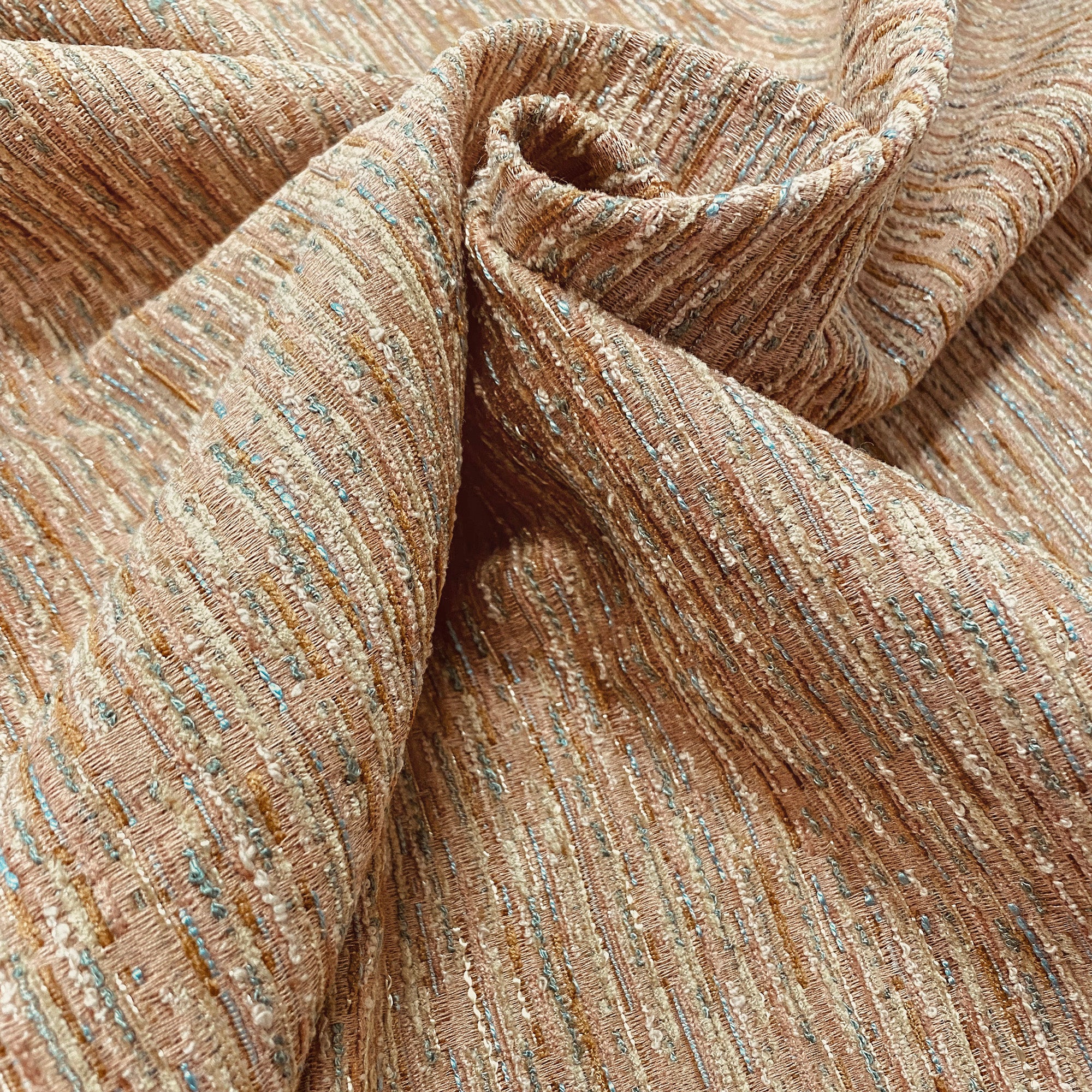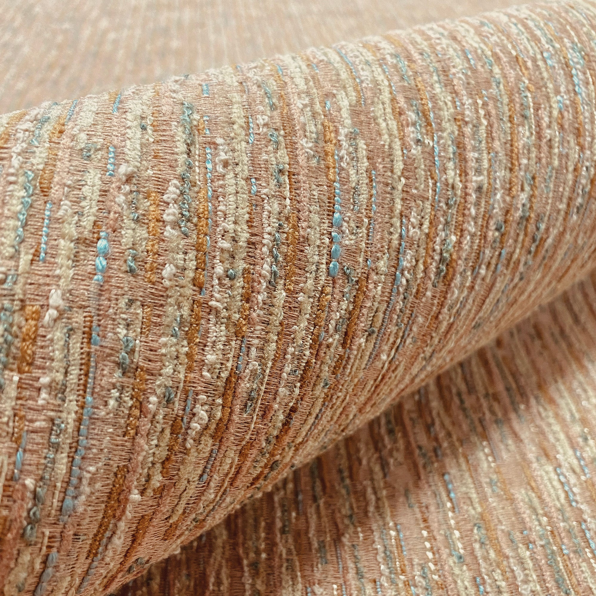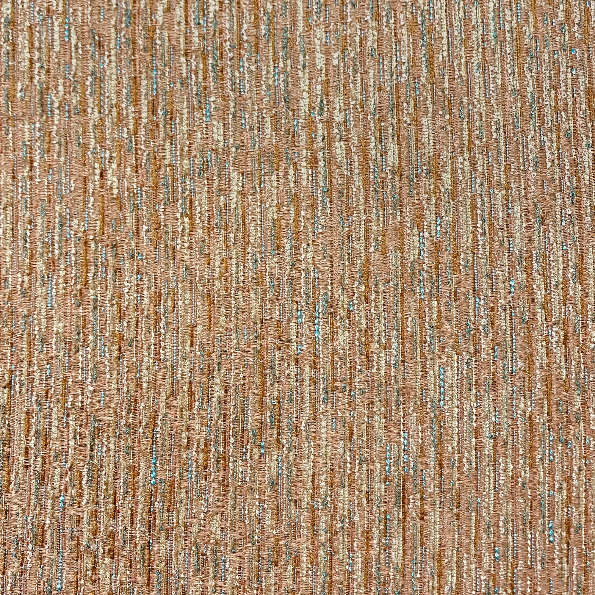 This luxurious textured woven upholstery fabric in coral and salmon hues with metallic baby blue threads meets flair with versatility, offering the perfect personal touch for any bohemian aesthetic. Designed and crafted by skilled textile artisans this fabric is made to last and never compromises on quality. All fabric is sold by the yard in 1-yard increments. Unfortunately, we do not accept returns on fabric orders but swatches are available.
