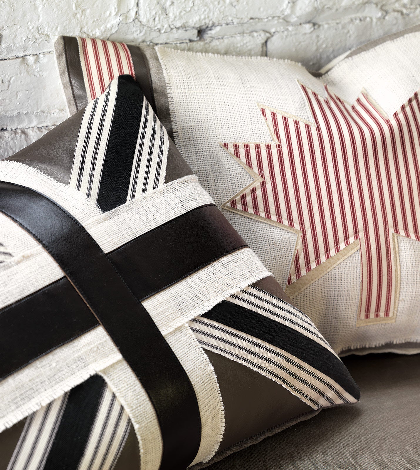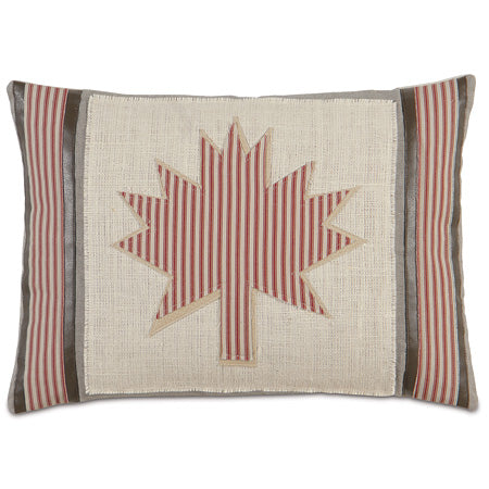 - Red pinstriped pillow with a maple leaf stencil and 100% jute beige fabric inset