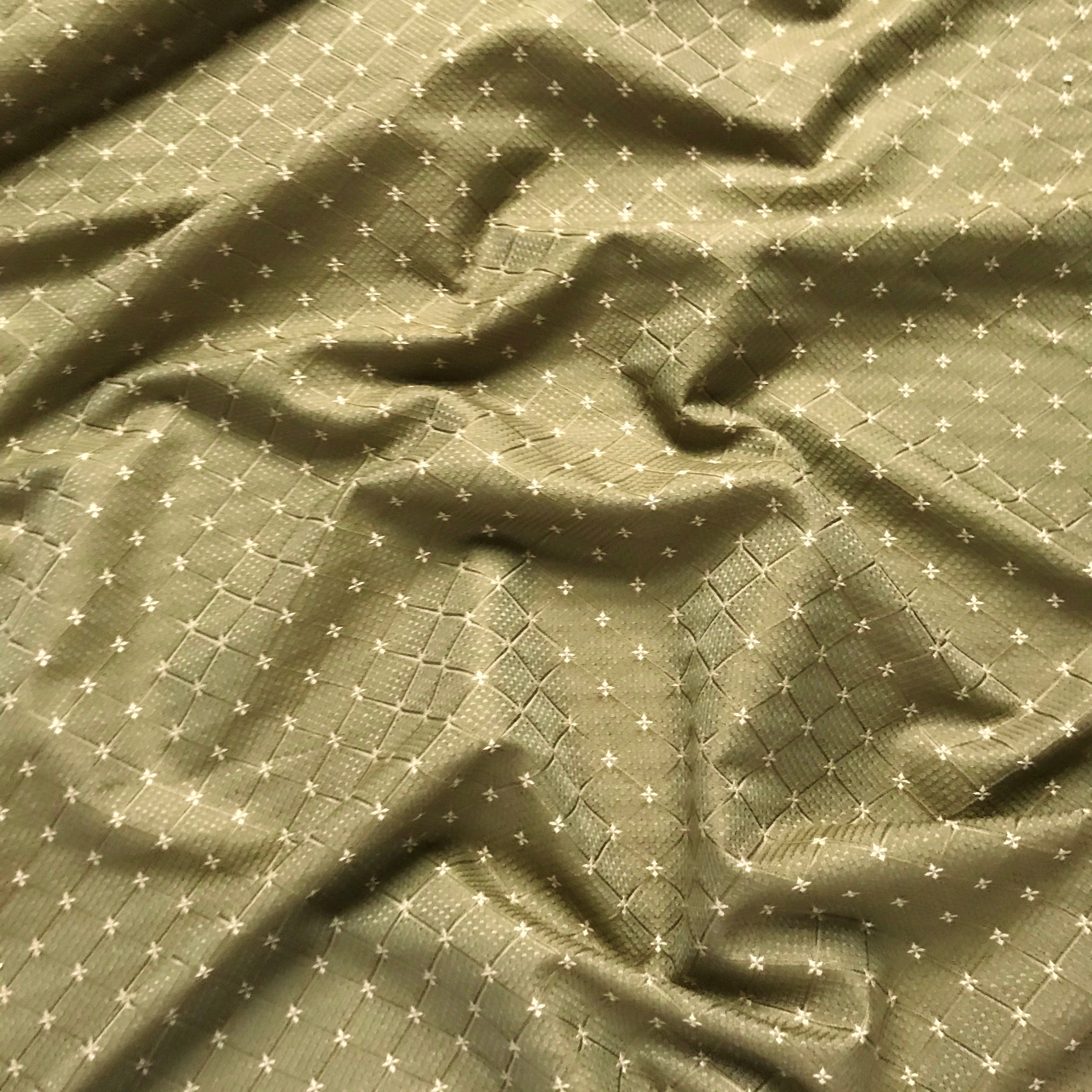 Substantially embroidered geometric trellis design stands out with its cream threading on luxuriously saturated olive green hue.
