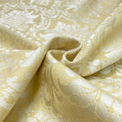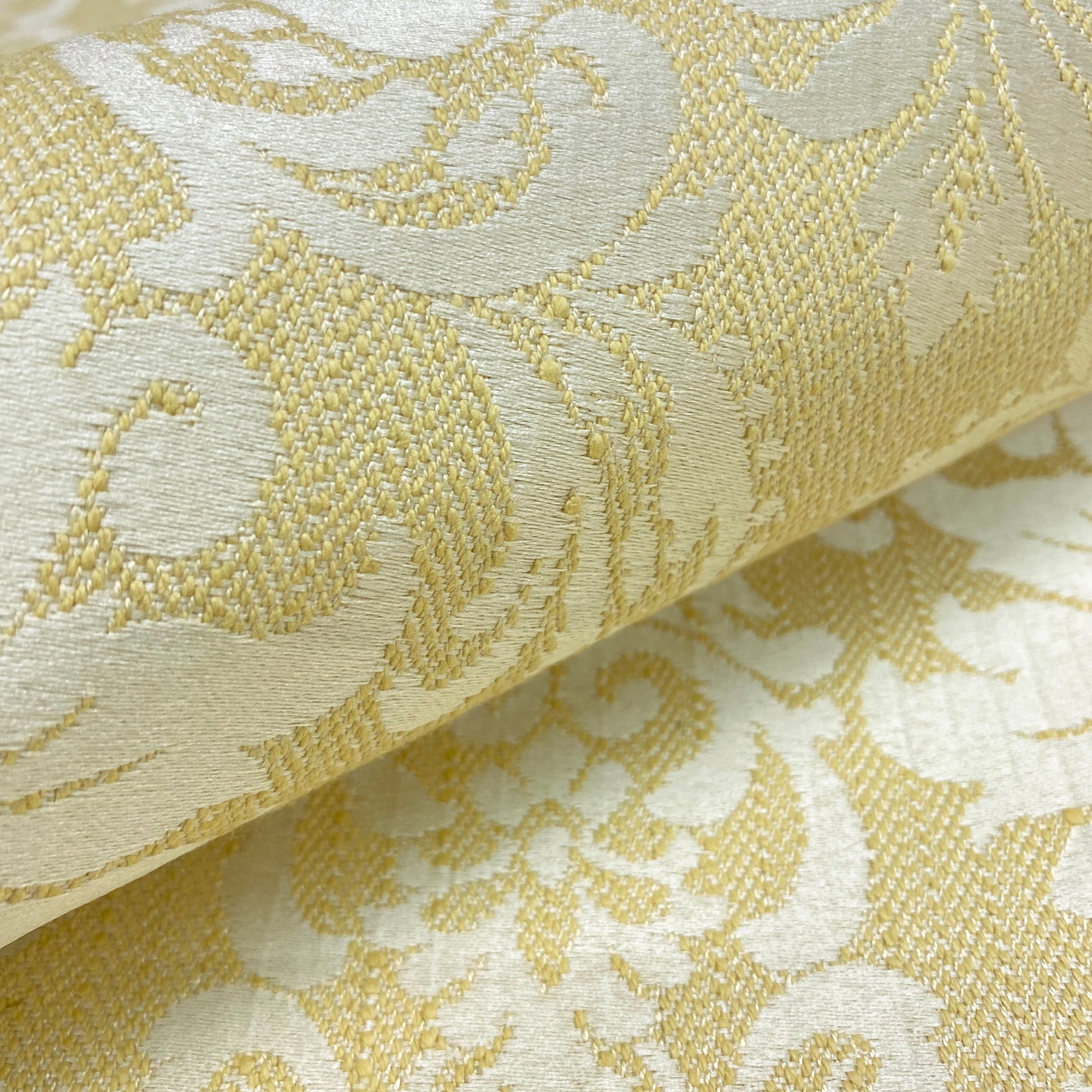 Traditional brocade upholstery fabric with a bohemian botanical inspired damask pattern in vanilla and ivory.